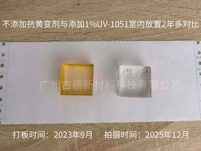 抗黃變劑UV-1051作為UV-1050的升級產品,繼承了優異的抗紫外線性能外,著重提升了環氧樹脂其室內抗黃變和抗熱老化性能。